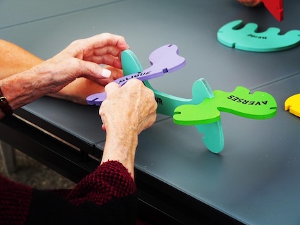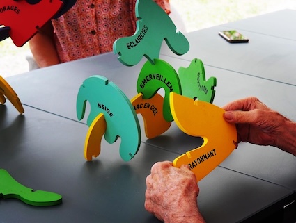 Dans le cadre de mon projet de diplôme, je suis allée à la rencontre de personnes atteintes de la maladie d'Alzheimer. La résidence Malgazon à Saint-Péray m'a ouvert ses portes pour que je puisse proposer certains de mes dispositifs aux résidents. Le jeu "Bois" est un moyen de favoriser la communication en utilisant à la fois de la couleur, des formes, des emboitements, le toucher ainsi que des mots ressortants des champs lexicaux de la météo et des émotions.