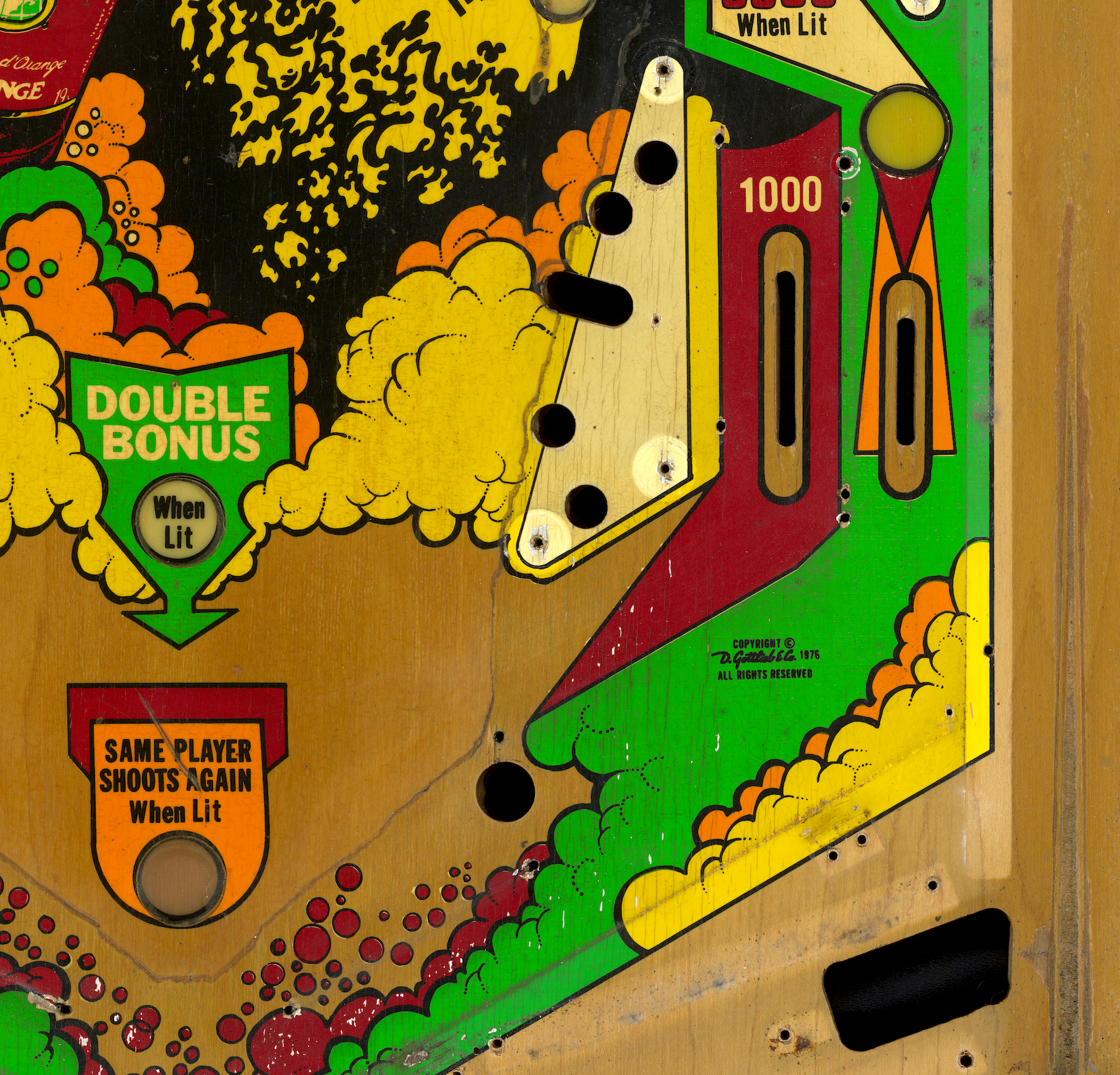 Rénovation d'un plateau de flipper "Canada Dry" avec FlippersCollection. Les photos du haut sont après rénovation et celle du bas avant rénovation. Travail de rafraichissement, sérigraphie industrielle et vernissage, comme neuf !