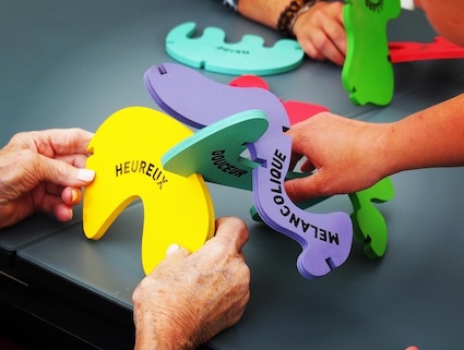 Dans le cadre de mon projet de diplôme, je suis allée à la rencontre de personnes atteintes de la maladie d'Alzheimer. La résidence Malgazon à Saint-Péray m'a ouvert ses portes pour que je puisse proposer certains de mes dispositifs aux résidents. Le jeu "Bois" est un moyen de favoriser la communication en utilisant à la fois de la couleur, des formes, des emboitements, le toucher ainsi que des mots ressortants des champs lexicaux de la météo et des émotions.