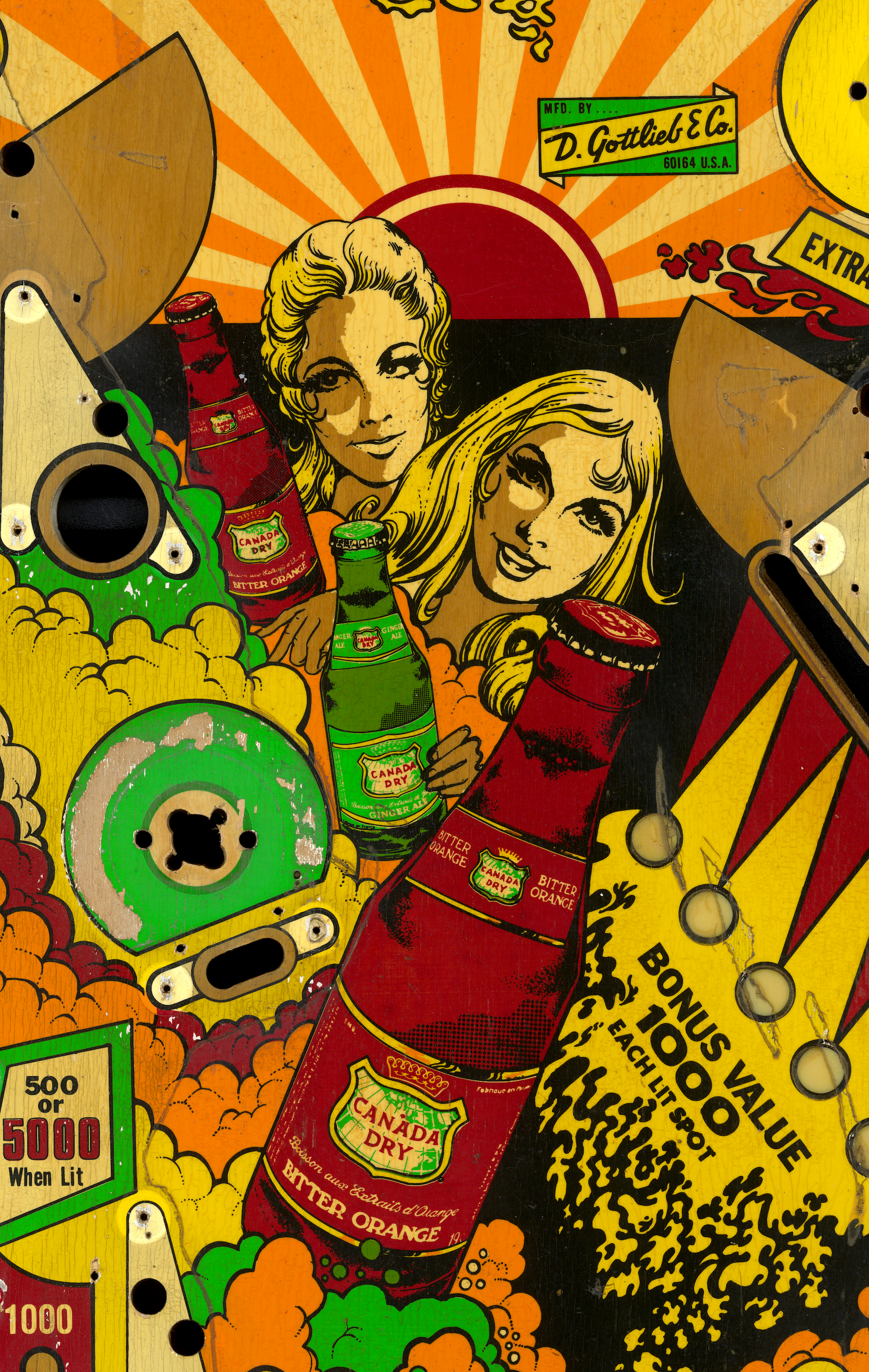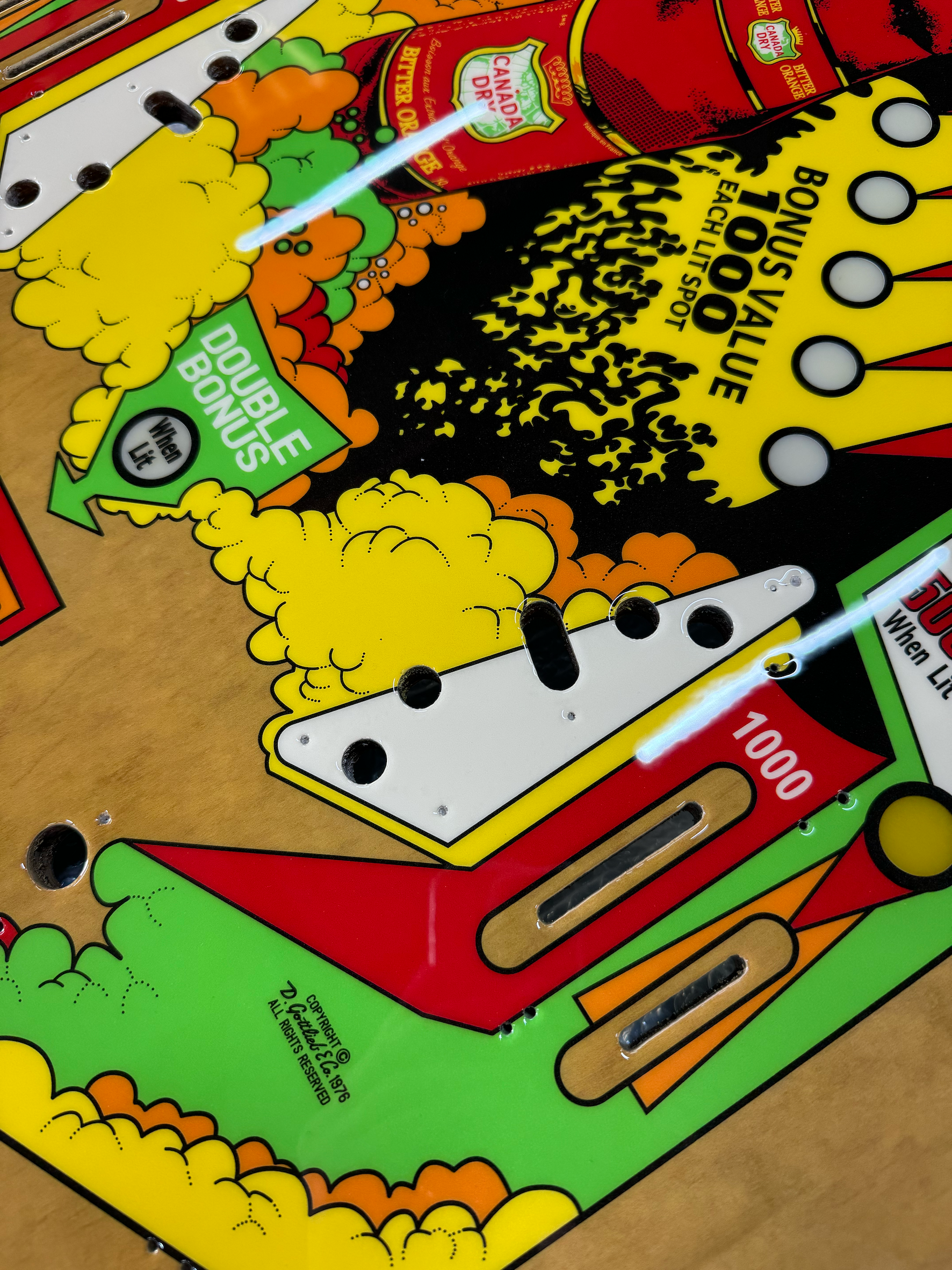 Rénovation d'un plateau de flipper "Canada Dry" avec FlippersCollection. Les photos du haut sont après rénovation et celle du bas avant rénovation. Travail de rafraichissement, sérigraphie industrielle et vernissage, comme neuf !