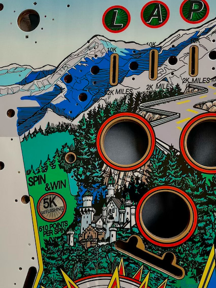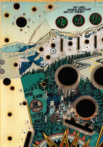 Rénovation d'un plateau de flipper "Checkpoint" avec FlippersCollection. Les photos du haut sont après rénovation et celle du bas avant rénovation. Travail de reprises, sérigraphie industrielle et vernissage, en route pour bruler l'asphalte !
